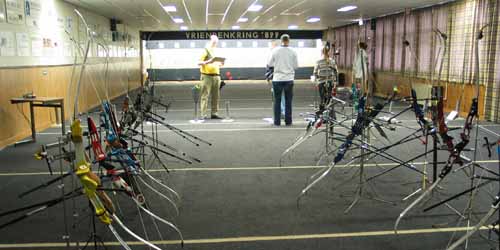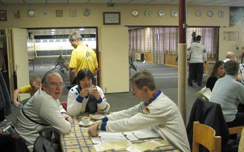 VIJFDE BONDSWEDSTRIJD 3-PIJL 18-METER BIJ DE VRIENDENKRING OP 7-11-2004 naar de uitslag naar Ulvenhout naar Etten-Leur Op twee man na iedereen op tijd present in Rijen. De Vriendenkring heeft een mooie ruime baan waar we prima worden ontvangen. Eerst opspannen en nog even relexen. Door op 18 meter te schieten ontstaat veel ruimte om de bogen weg te zetten. Cor had er zin in en schoot een PR van 1 te kort voor de 9. Prima! Twee minuten voor de aftrap. Waar schiet ik? Staan de pijlen goed? Hier is het om te doen, allemaal tienen schieten? Volop concentratie. Eerst schrijven met twee man, dan pas aan de pijlen komen.