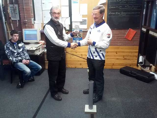 Dartwedstrijd 2015 op 18-1-2015 Jac kon de dubbele 3 niet vinden en zo ging uiteindelijk Leo na een sterke finish toch weer met de prijs lopen.
