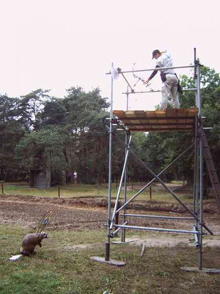 Voor degenen die (nog) niet weten wat een 3D-wedstrijd is, het is een nabootsing van het jagen met de handboog. Uiteraard worden hier geen echte dieren voor gebruikt. Er wordt geschoten op schuimplastic dieren die op onbekende afstand in de natuur staan. Iedere handboogschutter kan met zijn eigen materiaal meedoen. Om het eerlijk te houden wordt je wel in klasses ingedeeld. Je kunt een compoundboog met alles erop en eraan en carconpijlen niet vergelijken met een longbow waar niets op zit die dan ook nog met houten pijlen schiet. De compounds en recurves zijn beide in 3 klassen onderverdeeld en is er een aparte longbowklasse (elk nog verdeeld in heren, dames, volwassenen, jeugd en aspiranten). En omdat deze verschillende soorten bogen (en mensen) niet allemaal even makkelijk en trefzeker schieten, worden er op verschillende afstanden, aparte schietpaaltjes voor de diverse klassen geplaatst. Rood voor de vizierschutters, blauw voor de rest en geel voor alle aspiranten. Een treffer levert 17 punten op bij de eerste pijl, een kill (zeg maar een treffer in de hart long streek) 20. De tweede pijl geeft 14 voor een kill en 11 voor een treffer. De derde pijl 8 respectievelijk 5 punten. Ieder schiet dus maximaal drie pijlen op elk doel. Eén treffer is genoeg. Het nadeel is wel dat als er veel mis geschoten wordt, er ook veel naar pijlen gezocht moet worden. Overigens worden pijlen die van een ander zijn netjes ingeleverd bij de diverse posten. Je bent zelden een pijl definitief kwijt. Alleen als je andere dingen raakt dan de doelen, zoals bomen of stenen, dan kun je wel eens een pijl kapot schieten. Onze score in pijlen: Na twee dagen: Erik twee stuk, Kelly en Rick alles kompleet en heel.