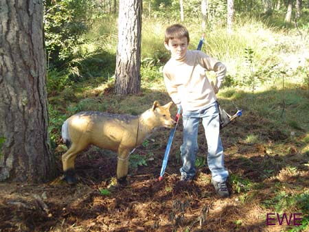 Eerst maar eens de tenten opgezet in de wei/camping. Het was een schapenwei waar men voor toiletten en stromend water had gezorgd. De wedstrijd was heel mooi weggezet door de parcourbouwers, vrijwel elk schot was moeilijk. Er waren echter maar weinig banen waar er geen echte mogelijkheid was om te scoren. Soms zaten er wat takken in de weg maar door te gaan verstaan of knielen was dit bijna altijd op te lossen. Het weer werkte ook mee het was lekker zonnig. Des te vreemder dat we begonnen met het schot op de ijsbeer. Jemig de pemig wat stond die ver weg zeg, ik heb de stappen geteld op de terugweg, 83 stappen, dus dat ding stond op minstens 70 meter. Doordat hij dan bijna 2 meter hoog is lijkt hij veel dichterbij. Wij schoten allemaal te kort. Ook stonden er tentjes met broodjes hamburger en wat te drinken. Rond 5 uur waren we klaar en moe van een dag in het bos.