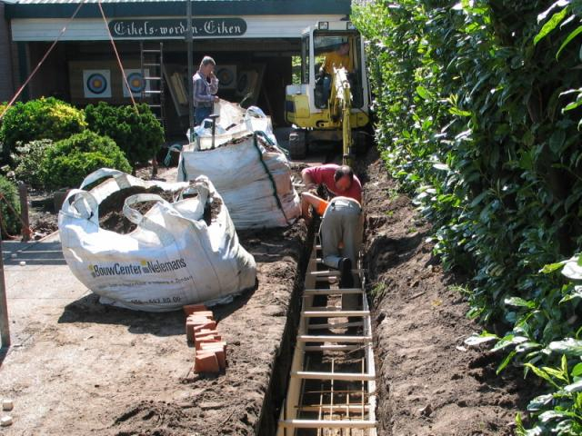 Intussen was Hans al begonnen de sleuf te graven. Negentig cm diep zat de vaste grond. De laatste paar cm moest met de schop in verband met de gladde onderlaag. Jac volgde de graafmachine op de voet in de sleuf en hield zo een gladde voer in de sleuf op vaste grond over. Jac had van twee stukken lat een kaliber gemaakt voor de breedte.