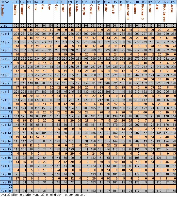 Het laatste schot moet met dubbel eindigen. De kunst was om op tijd triple te schieten (3 keer het aantal punten). Dus het was een kwestie van een beetje geluk en veel schietkunst. Vooral de jeugd vermaakte zich naar behoren. Al gauw waren de potentiele winnaars in de buurt van de 0 en moesten nog een dubbel schieten: Erik, Jac, Leo, Gert-JanRick van Gorp, Kim Mertens en Diede. Na veel proberen scoorde Eric dubbel 1 en was de wedstrijd beslist.